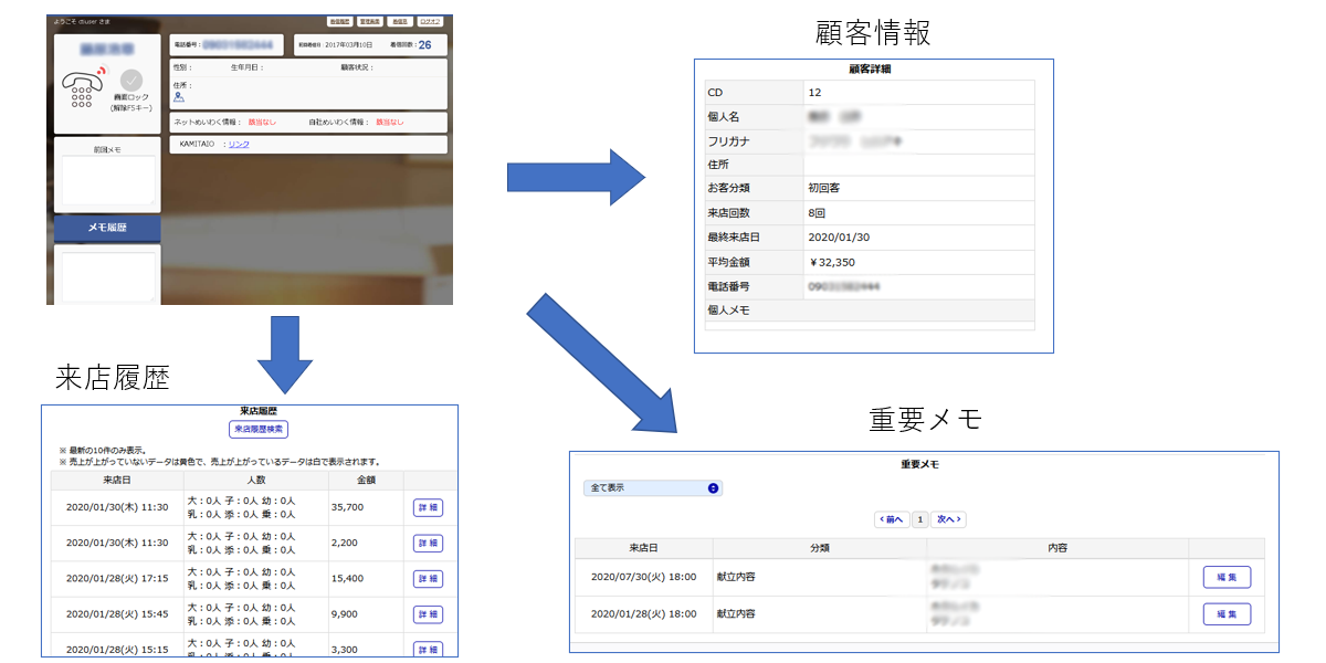 電話の着信時に顧客情報や来店履歴等が表⽰されます。