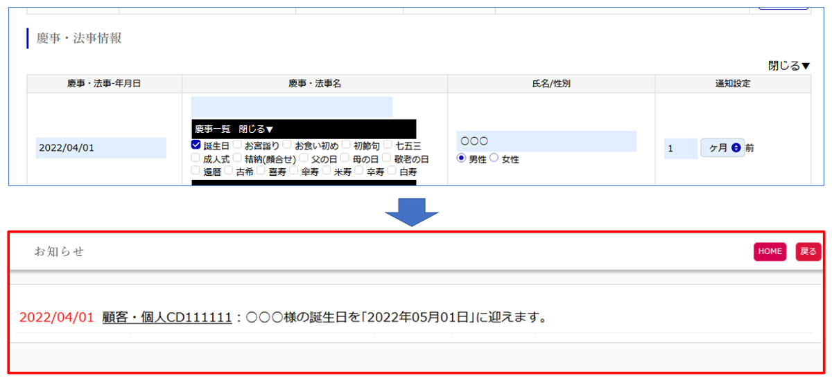 あらかじめ顧客の慶事(誕⽣⽇、成⼈式等)・法事(初七⽇、⼆七⽇等)の情報を⼊⼒しておくことで数⽇前・数ヶ⽉前にお客様の情報を知ることができます。